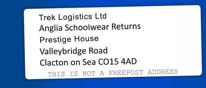 Please note: If you have an item from a 'Pop Up Shop' at a School Sale or a Pupil Premium order you wish to return please do not use the address below. Contact Customer Support via the following email address
